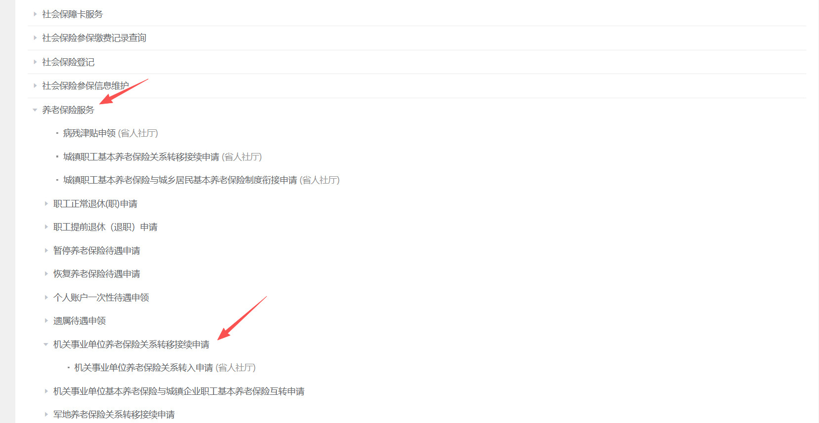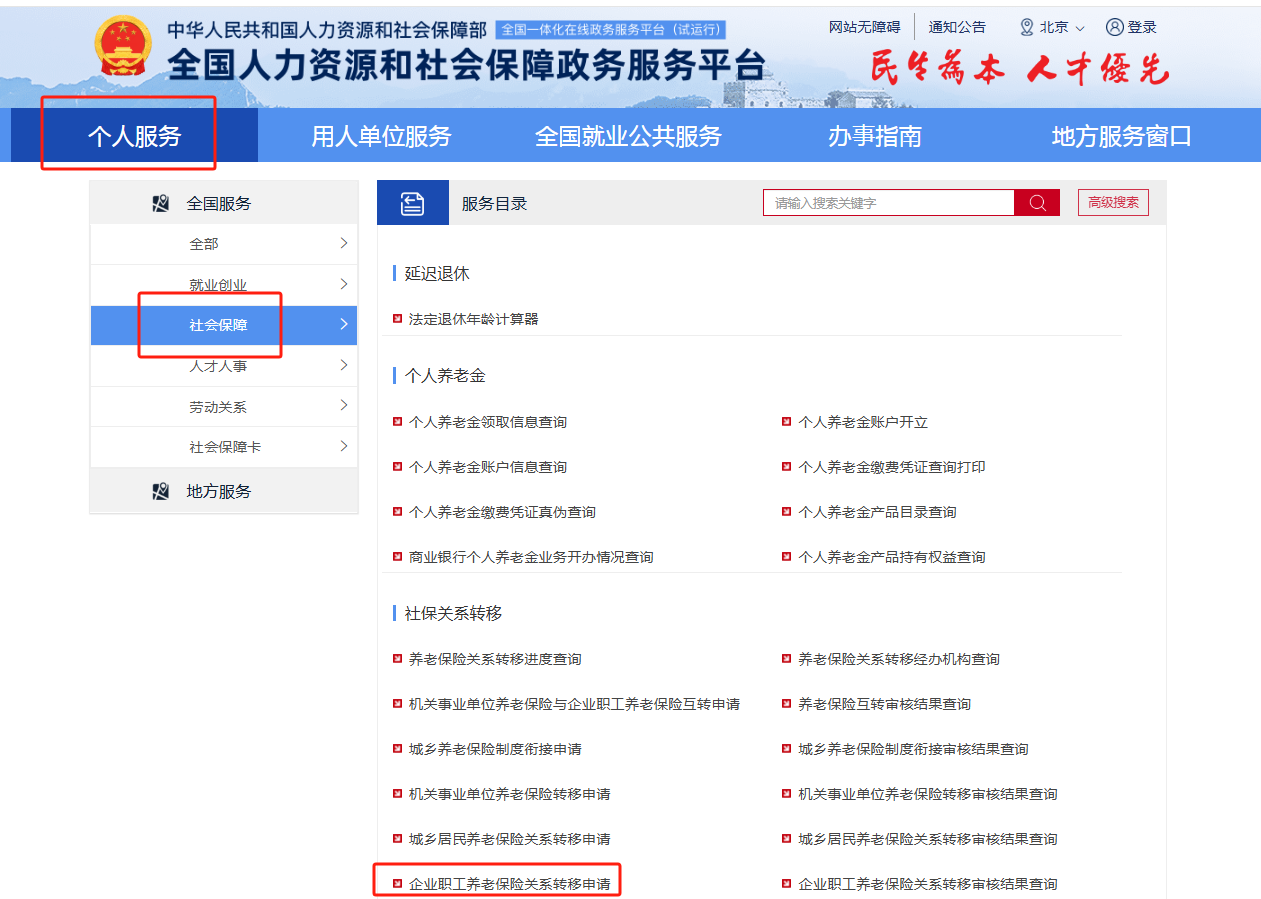 ②全國人力資源和社會(huì)保障政務(wù)服務(wù)平臺-個(gè)人服務(wù)-社會(huì)保障-企業(yè)職工養(yǎng)老保險(xiǎn)關(guān)系轉(zhuǎn)移申請