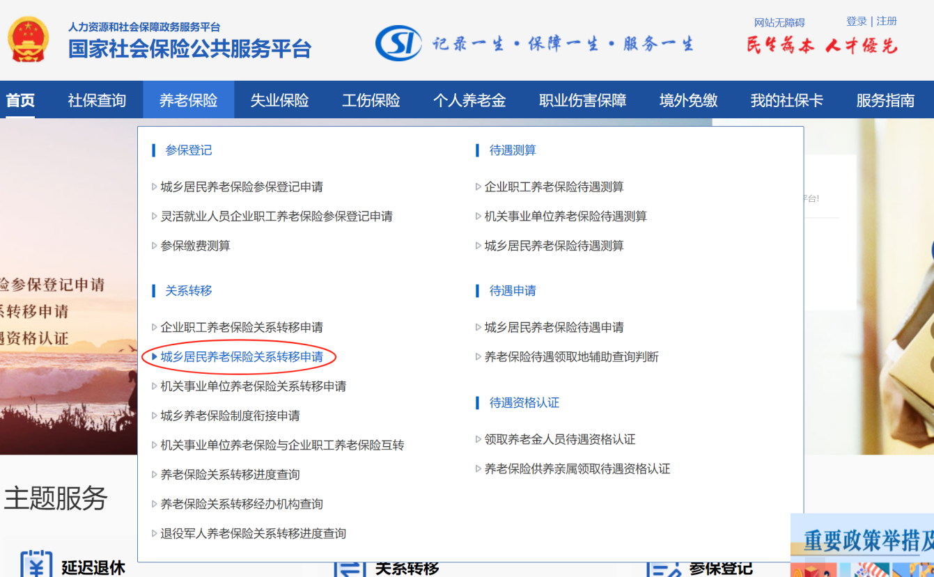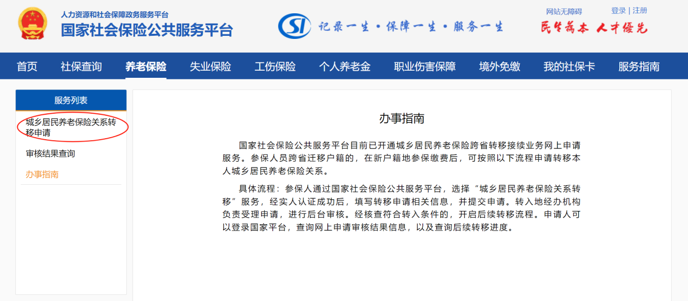 2.登錄國家社會(huì)保險(xiǎn)公共服務(wù)平臺→“養(yǎng)老保險(xiǎn)”→“關(guān)系轉(zhuǎn)移”。