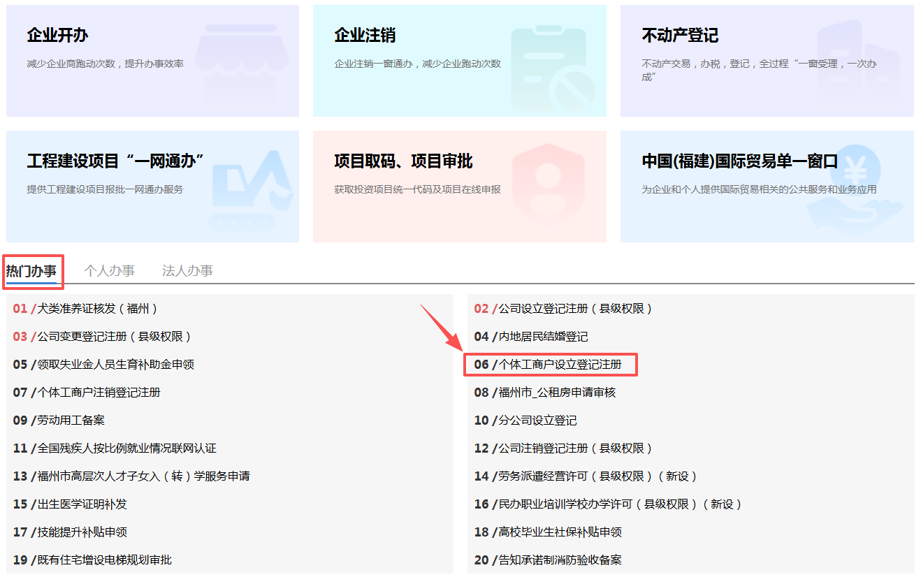 2.找到頁面中的“熱門辦事”,點擊“個體工商戶設立登記注冊”。