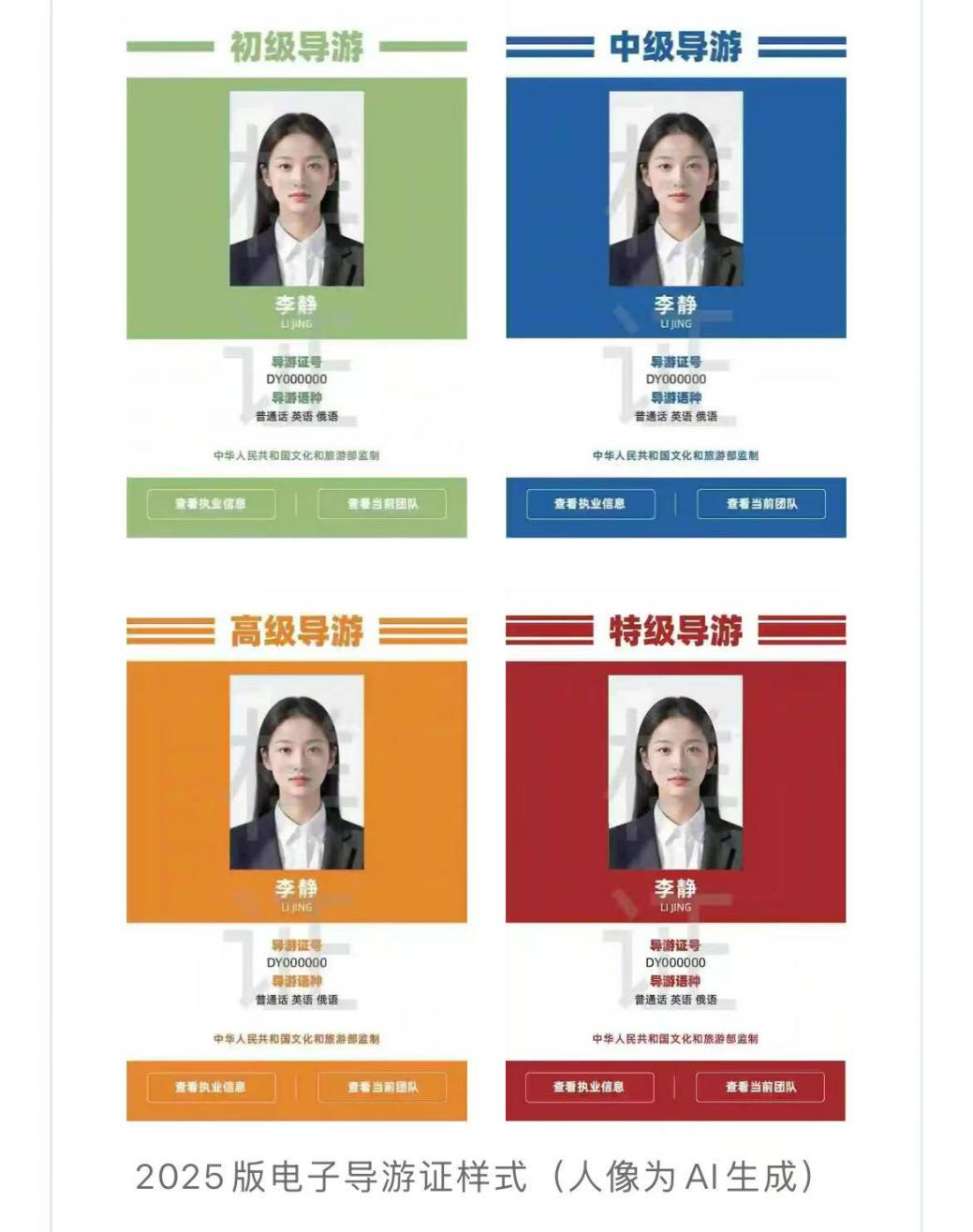 2025版電子導游證及導游身份標識卡均采取豎版證件樣式,證件主色調按照導游等級進行區分,初級導游為綠色、中級導游為藍色、高級導游為橙色、特級導游為紅色。