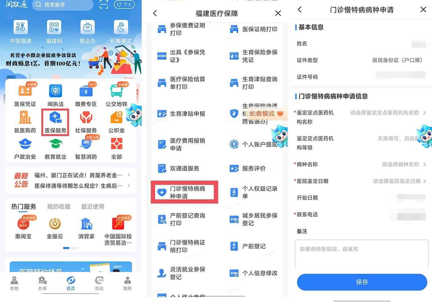 參保人員登錄閩政通APP,點擊【醫保服務】,點擊【門診慢特病病種申請】,填寫相關信息點擊【保存】提交申請。