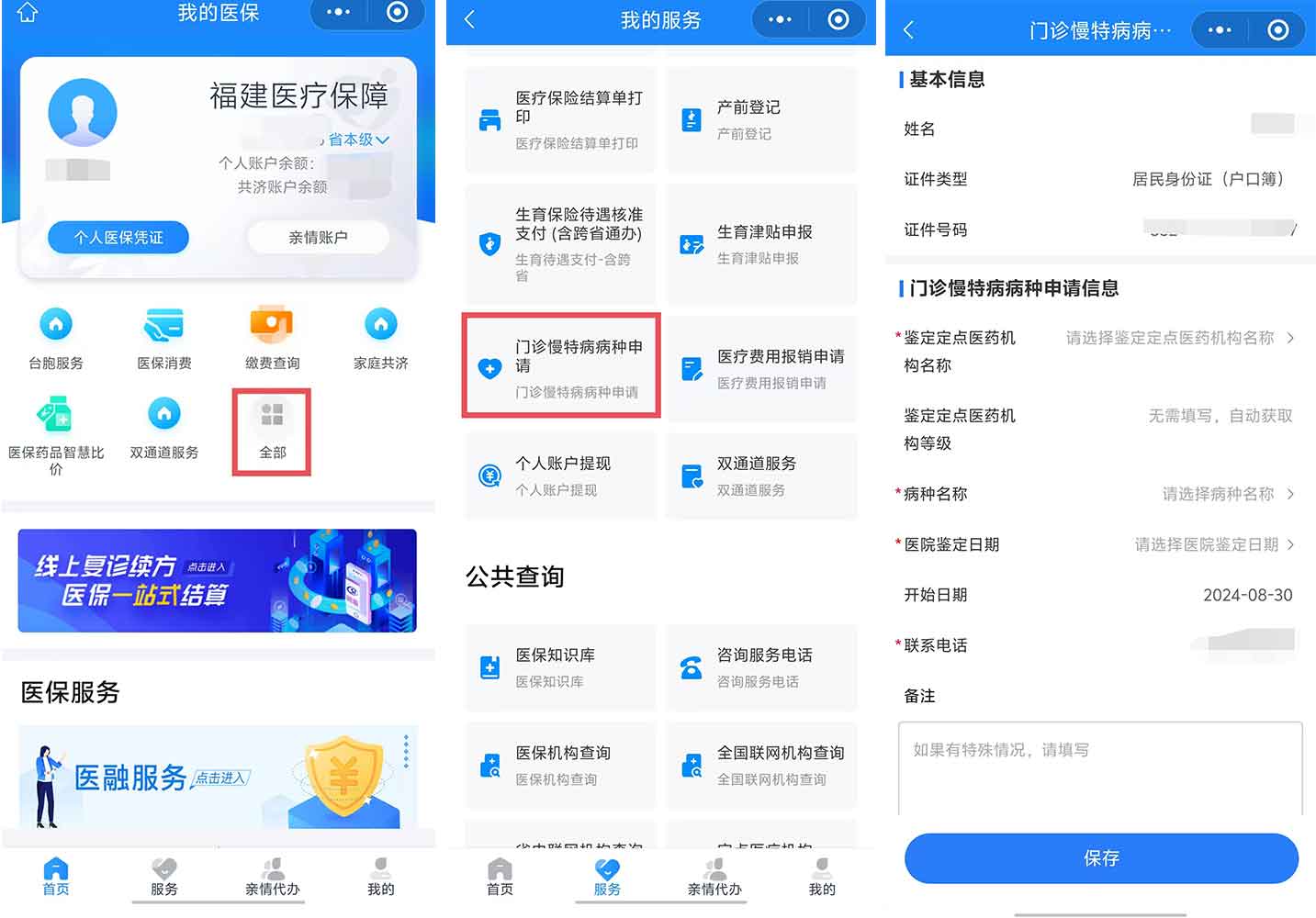 參保人員進入“福建醫療保障”微信小程序,點擊【全部】,點擊【門診慢特病病種申請】,根據提示填寫相關信息,點擊【保存】,完成備案。