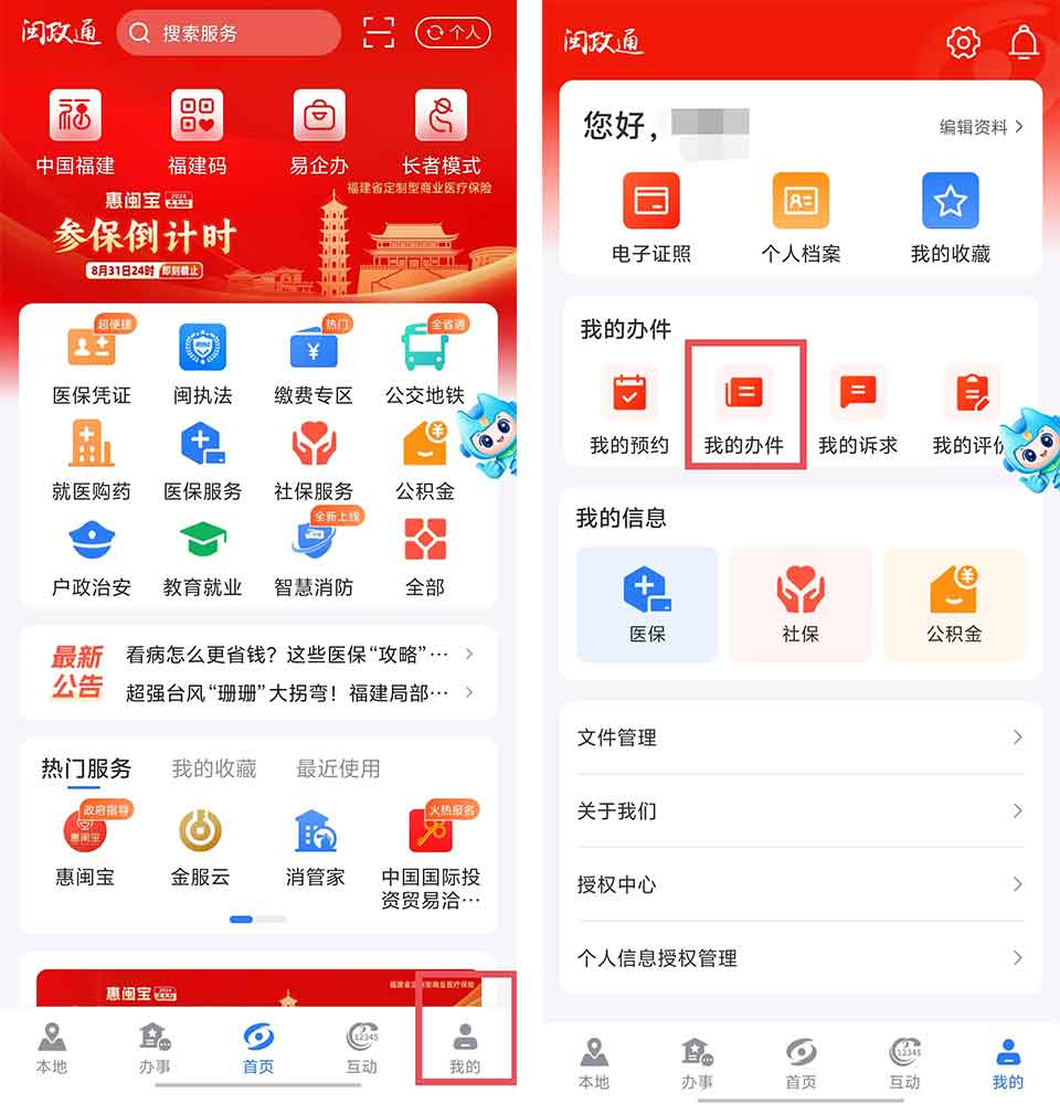 參保人員登錄閩政通APP,點擊【我的】,點擊【我的辦件】即可查看辦理進度。