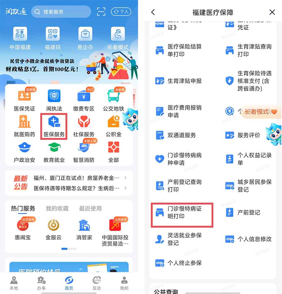參保人員登錄閩政通APP,點擊【醫保服務】,點擊【門診慢特病證明打印】,即可打印門診慢特病證明。