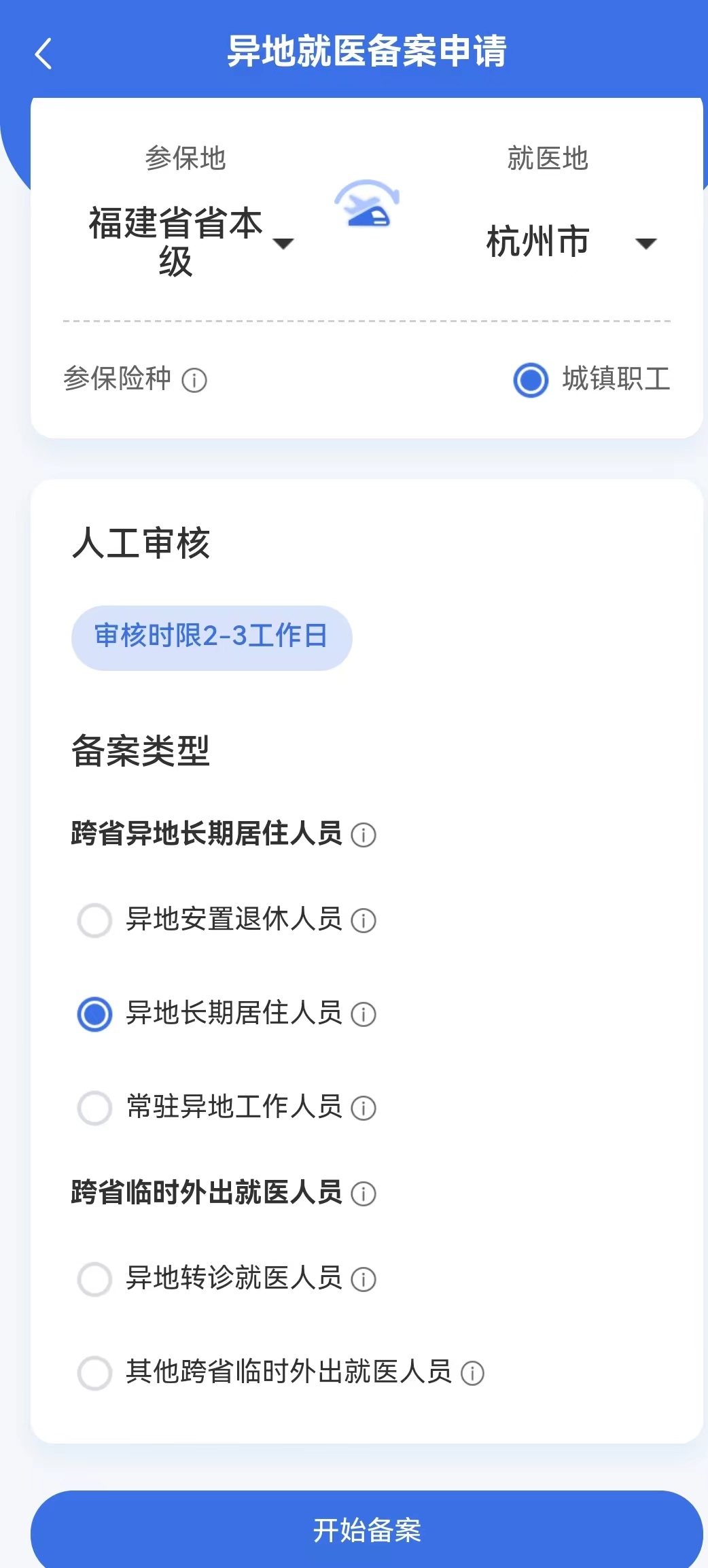 第二步,點(diǎn)擊【異地就醫(yī)備案申請】,選擇就醫(yī)地,選擇備案類型,點(diǎn)擊【開始備案】。