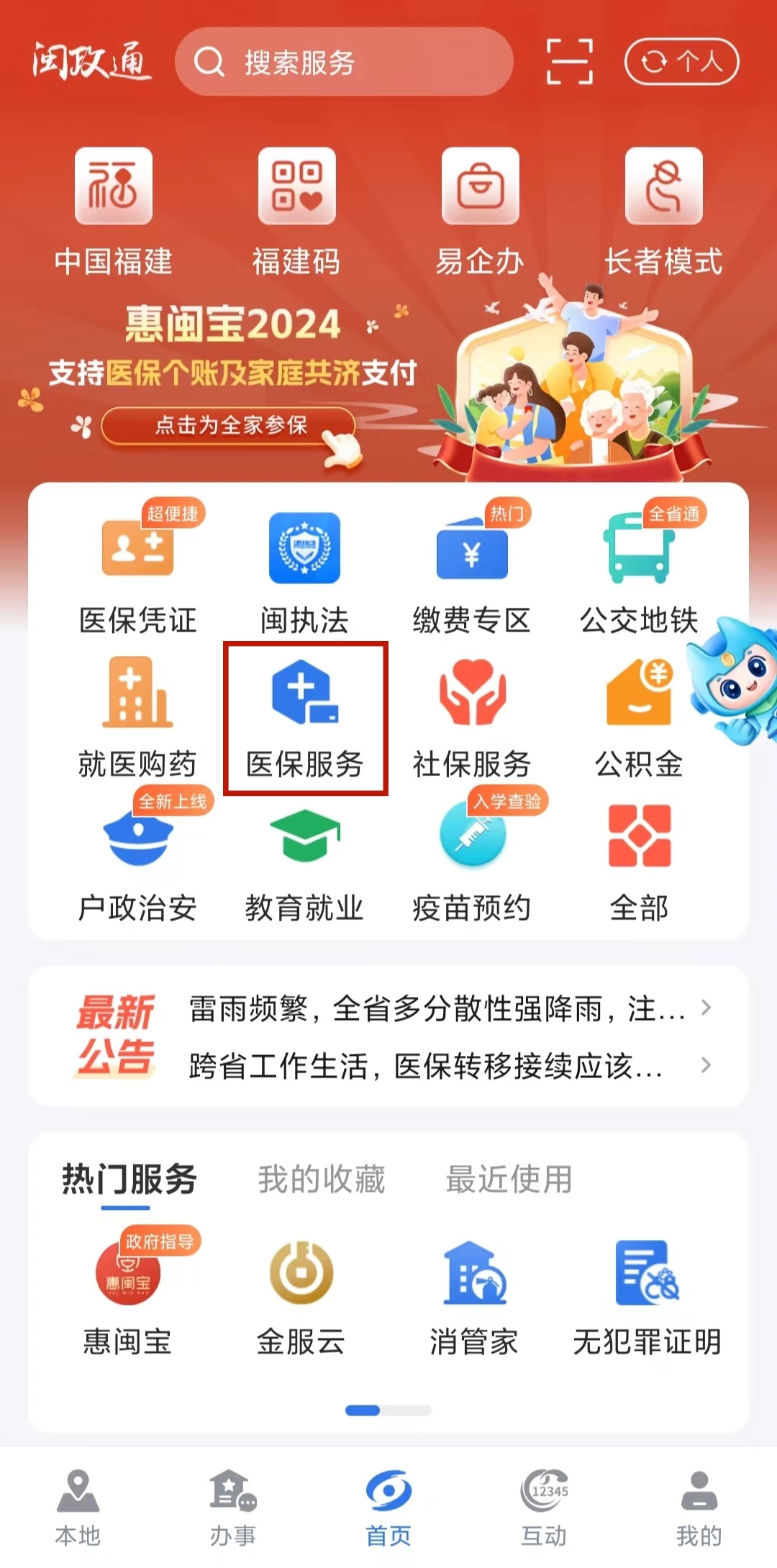 第一步,打開閩政通APP,點(diǎn)擊【醫(yī)保服務(wù)】。