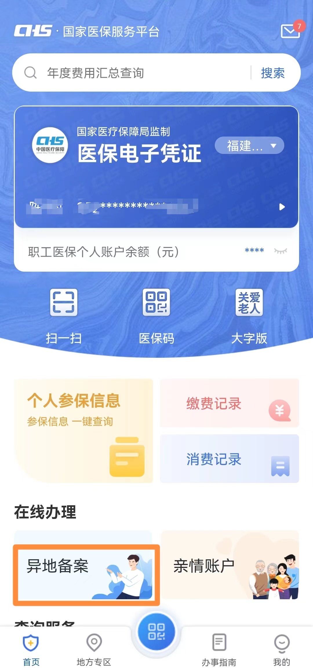 第一步,進(jìn)入國家醫(yī)保服務(wù)平臺(tái)APP首頁,在【在線辦理】模塊,點(diǎn)擊【異地備案】。