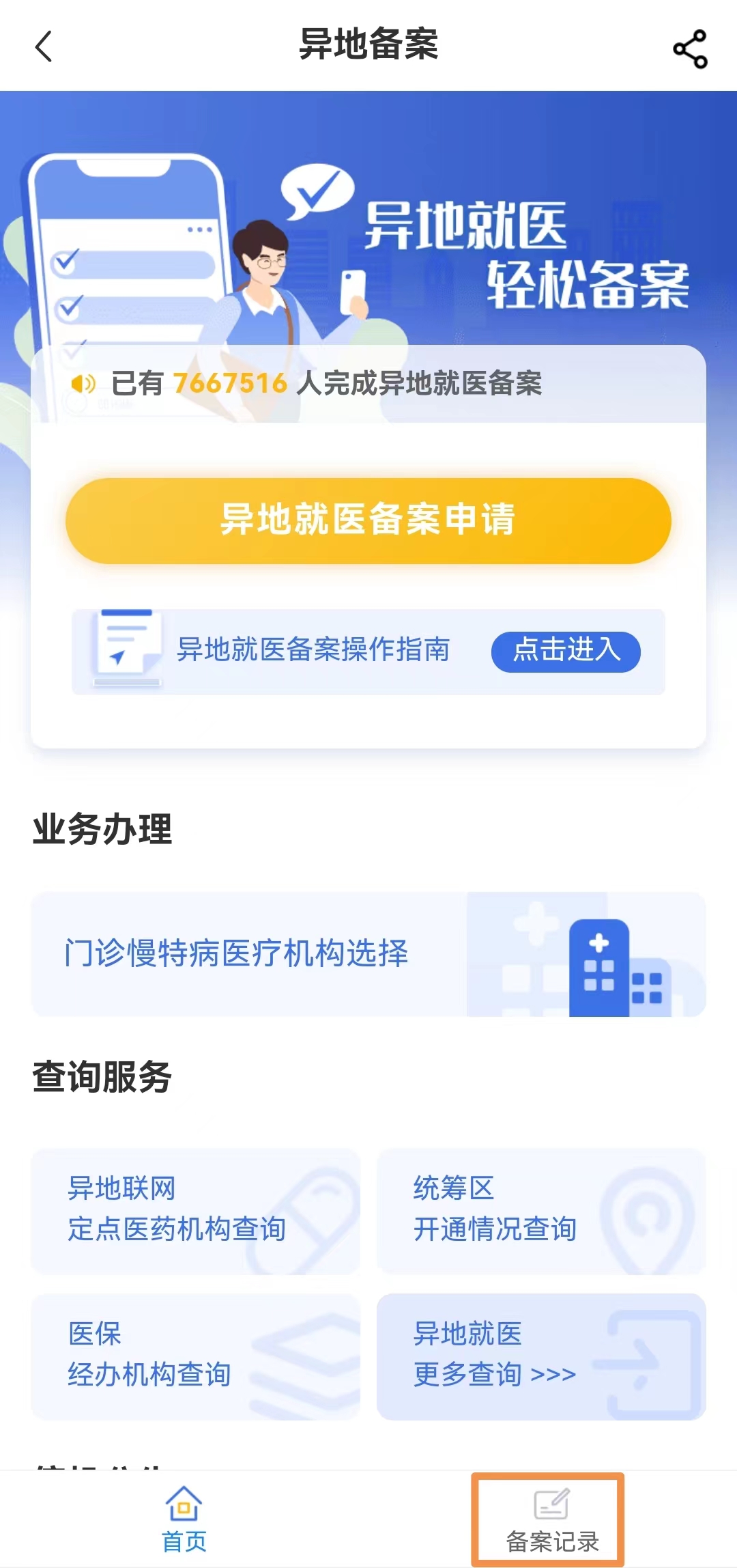 進(jìn)入國家醫(yī)保服務(wù)平臺(tái)APP首頁,點(diǎn)擊【異地備案】,點(diǎn)擊【備案記錄】,隨時(shí)查詢辦理進(jìn)度。